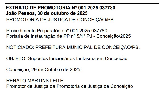 A Prefeitura Municipal de Conceição, no Sertão paraibano, é alvo de investigação do Ministério Público da Paraíba (MPPB) sobre a possível existência de servidores fantasmas. O caso foi aberto por meio do Procedimento Preparatório nº 001.2025.037780, instaurado pela Promotoria de Justiça de Conceição.