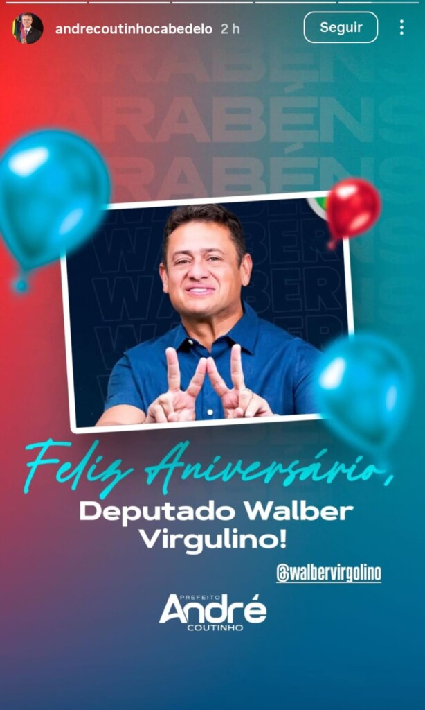 O clima político em Cabedelo começa a mudar de temperatura. Nesta quarta-feira (15), o prefeito André Coutinho (Avante) surpreendeu ao parabenizar publicamente o deputado estadual Walber Virgolino (PL), que completou 47 anos. O gesto, que circulou através de publicação nas redes sociais, tem peso simbólico: os dois foram adversários nas eleições municipais de 2024, mas agora ensaiam uma reaproximação.
