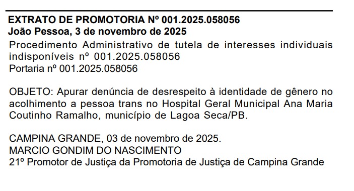 O Ministério Público da Paraíba instaurou um Procedimento Administrativo para apurar uma denúncia de desrespeito à identidade de gênero no acolhimento a uma pessoa trans no Hospital Geral Municipal Ana Maria Coutinho Ramalho, localizado no município de Lagoa Seca, no Agreste paraibano.