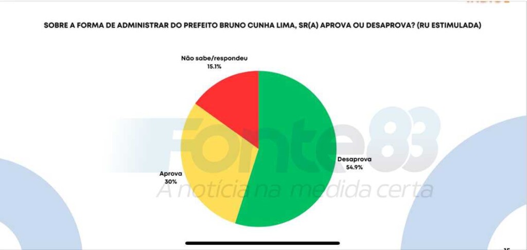 A pesquisa realizada pelo Instituto Índice sobre o cenário político-eleitoral na cidade de Campina Grande, divulgada nesta quarta-feira (6) com exclusividade pelo Portal Fonte83, mostra que 54,9% dos campinenses desaprovam o trabalho do prefeito Bruno Cunha Lima (União Brasil). Outros 30% responderam no sentido contrário e apontaram pela aprovação ao governo municipal.
