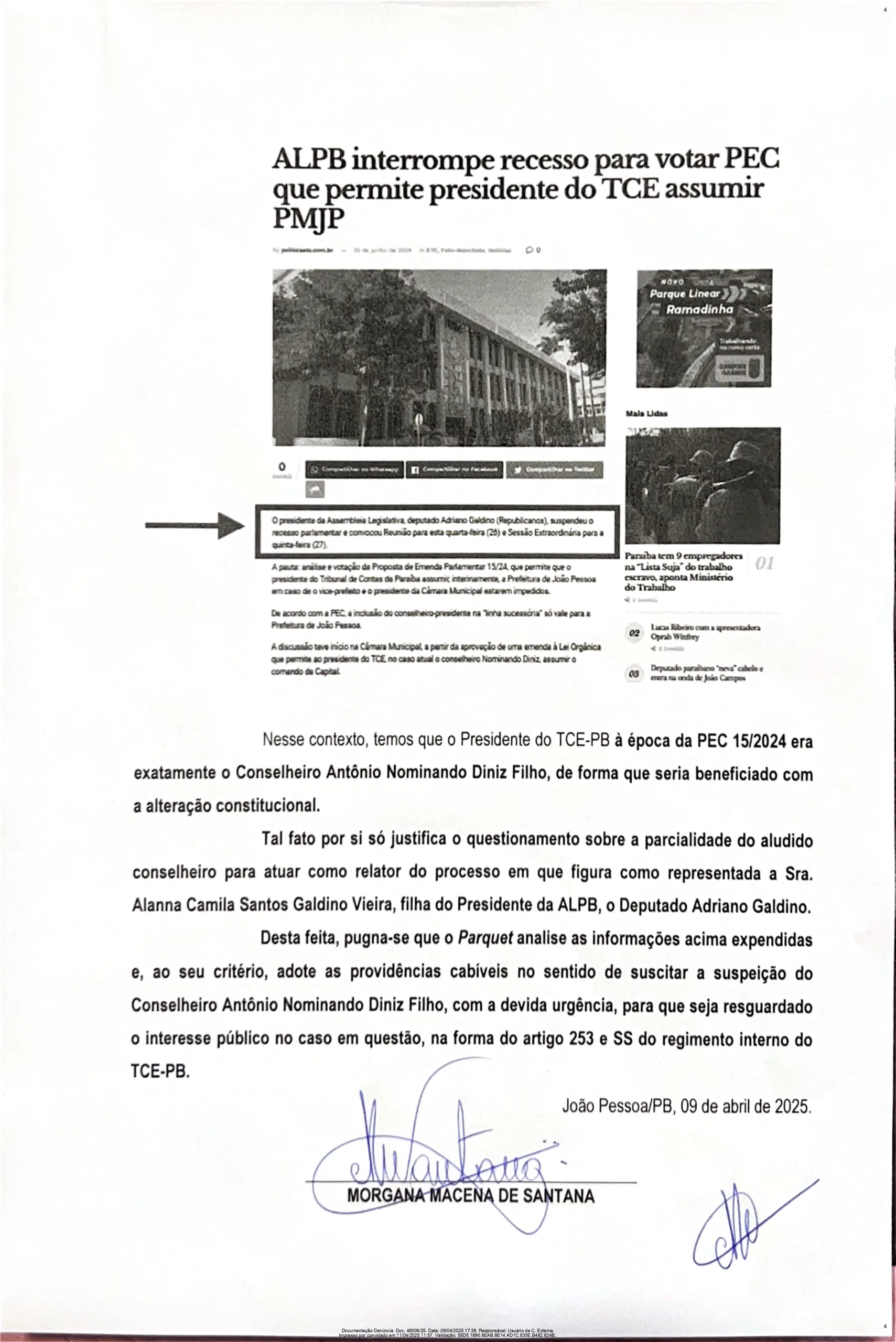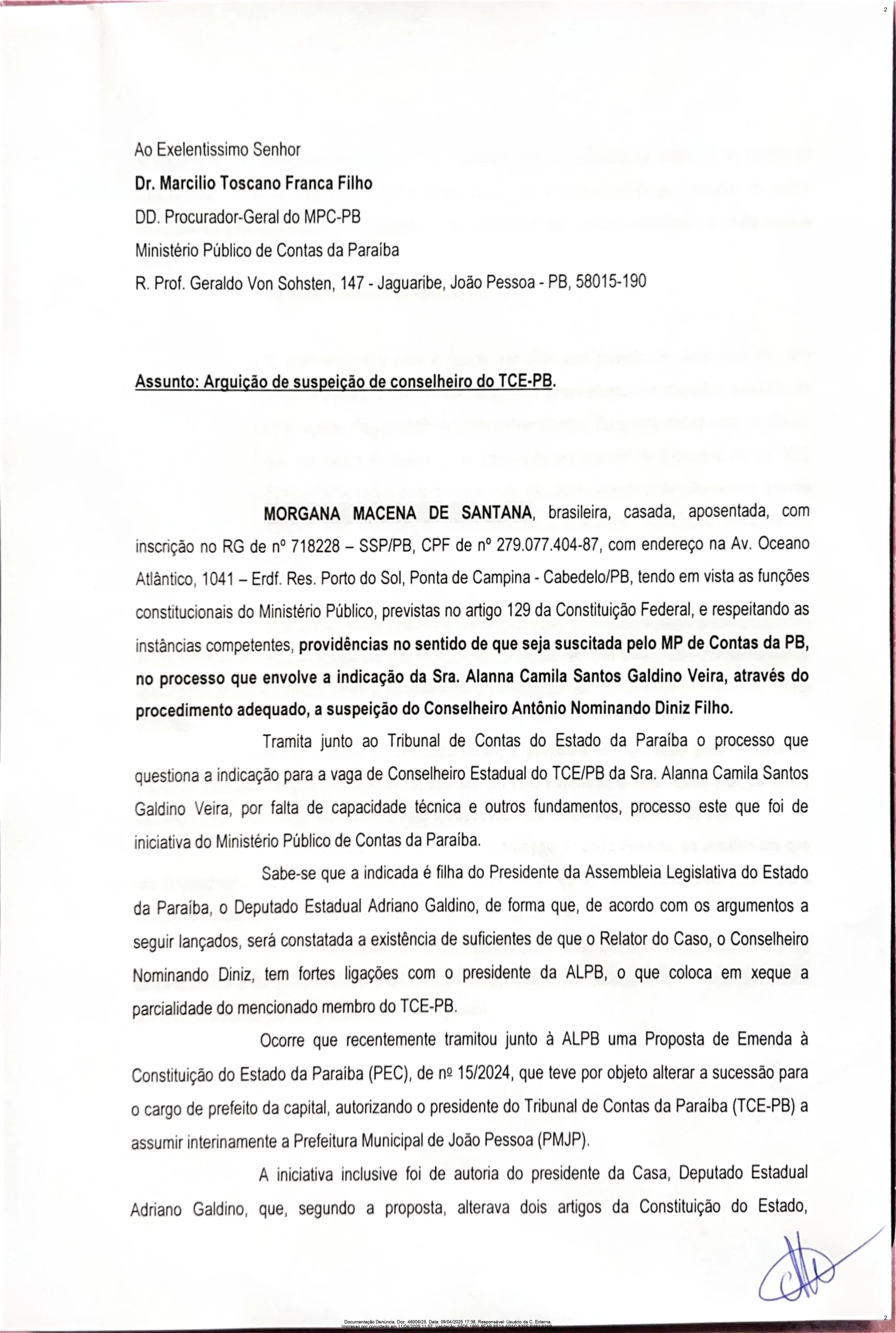 A representação foi apresentada por Morgana Macena de Santana, que aponta uma possível relação de interesse político entre Nominando e Galdino. Segundo ela, essa ligação comprometeria a imparcialidade necessária para a condução do processo de avaliação da indicação de Alanna Galdino ao cargo vitalício no TCE-PB.
