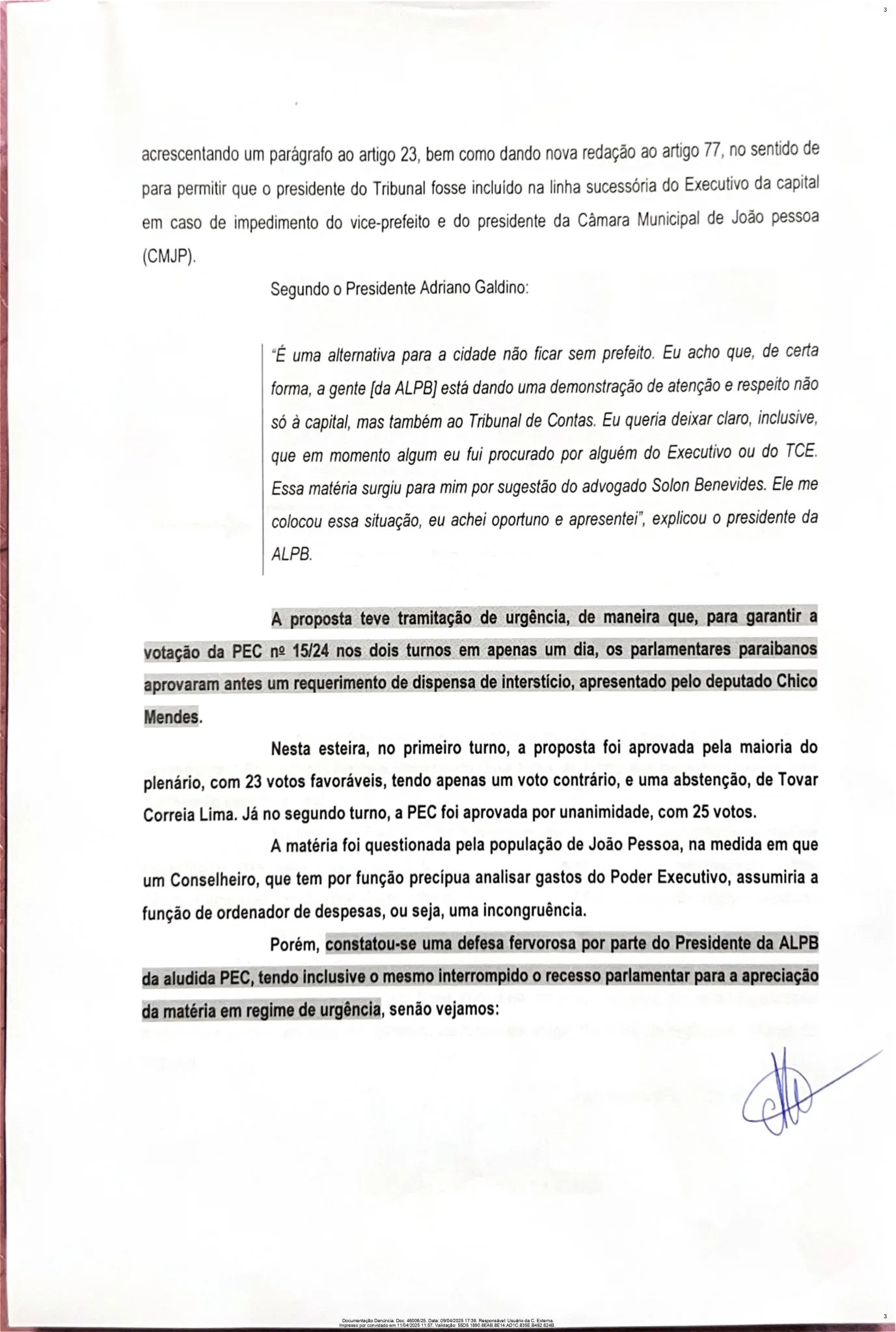 O documento menciona como evidência a Proposta de Emenda à Constituição (PEC) nº 15/2024, de autoria do deputado Adriano Galdino, aprovada pela ALPB no ano passado. A emenda modificou a linha sucessória da Prefeitura de João Pessoa, permitindo que o presidente do TCE-PB possa assumir interinamente a chefia do Executivo municipal de João Pessoa, em caso de vacância simultânea do prefeito e do vice.